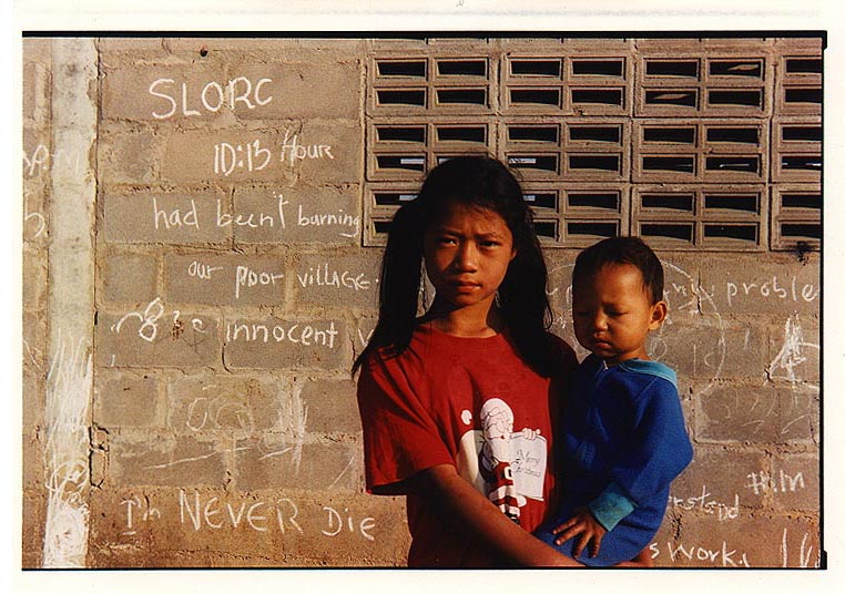 Children at the shell of the schoolhouse in Huay Ke Lok, a Karen refugee camp near Mae Sot, a few days after a cross-border attack by SLORC-supported guerrillas. (Click for full sized image) |