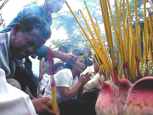 Inside, on the stage where my band Spank played a year and a half ago, a Thai band fronted by an emaciated but ultra-professional lead singer with girlish moves and hard, adult eyes builds a wall of disco. Behind them on a huge screen, black-and-white American gangsters in speedboats enjoy a flickering 1940s shoot-out. Tables are populated by little groups along classic lines: usually two or three taxi-girls, a couple of hangers-on and one heavy guy who sprawls smiling and confident behind an array of empty Angkor beers or a bottle of whiskey. This is one of those places where the real heavies buy $275 bottles of Johnnie Walker Blue and leave them half-drunk at the table. Fending off a couple of taxi-girls (a pleasant but vacant smile and glance away does the trick),we thread our way out for a stop at a new bar whose name is a combination of French and Khmer. Motor-bike taxis fill the street in front of the bar, which is, as I understand, operated by a team made up of a West African sports adviser to the Ministry of Youth, Education and Sport, and a tiny, tough ex--well, presumably ex--taxi-girl who used to go out on a long-term contracts with foreign men. Now she has gone into a business with a better future. There is no one here that I know, aside from Eric who I came with, as it seems most of the few friends of mine who are still here have gone so far as to have produced babies or at least gotten responsible about their jobs. Luckily, Alejandra, the Cuban singer at Le Royal Hotel shows up, alternately pointing out visiting Cuban emissaries and her impressive collection of scabbed abrasions from yesterday, when the moto-taxi she was riding ran one of Phnom Penh's few red lights, was broadsided and landed on top of her. OK, now it's late enough for me and I head home, and park my the bike that I sold off a year ago and have borrowed back in front of the FCCC, where a collection of moto-taxi drivers that I know will more or less keep it from getting stolen during the periods when they are not driving it up and down the street in front of my house at 2:00 a.m. They are aware that any remotely key-shaped object can start my bike up (they've known this about my bike for years) but they are totally unaware that every time they pass I can tell by the distinctive sound of nails rattling in a blender that it is my bike that they are vainly trying to force into a wheelie--something it probably lost the ability to do about ten years ago. Sometimes I go out on the balcony and watch them, relishing the irony that they have no idea that they are caught. But I don't really mind as long as they don't crash it. So I park, say hello to Dara who wants to move up from his moto and go into business as a car-taxi. He's found a government office that will lend him $1500 to buy a car, and only charge 20% interest for a year. What a deal! Especially since he only has to put up the deed to his sister's land as collateral. If he misses a payment, all that will happen is some government official will seize his sister's land. I had not known the government was officially operating a loan shark business. The alley that leads to my apartment, just five feet wide at the entrance, widens out into what in Italy would be a tiny piazza. Under a partial roof there is a wooden bed platform which has evolved over the last month into a thriving gambling den. A dozen players, male and female, old and young, throw cards and worn-out bills around the table, too fast for me to figure out the game, despite the urging of one of the moto-drivers who is so drunk on palm wine that he confesses to losing fifteen dollars there--a shocking amount. Cyclos are parked in the little alley, and he goes around waking up the sleeping cyclo-pedalers with pointless jabbering in half-English. They are surprisingly tolerant, but I suppose your expectations of comfort are low if you sleep every night outside in a cyclo. So are the days and nights in Cambodia. March 31, 2000So here we are in Cambodia, Eric and I, writing this book which is intended to show the color and give the feeling of this place, and both of us looking forward to being somewhere else. This is an example of why.The first part we are working on--what we intend to sell as an article--is about the grenade attack on an opposition rally three years ago, the one that killed at least 15 people in front of the National Assembly. I've been writing their stories, how they got there, how some tried to save each other--soldiers told them they could not, or they would be shot dead. How they died waiting for the ambulances, and how everybody here knows exactly who must have ordered it, only they are too frightened to say it (almost all Cambodians) or paid not to say it (almost all expats), because of course it is the prime minister himself, Hun Sen. Yesterday was the third anniversary of this massacre, and still no one has been arrested. The government's investigation has produced nothing at all, which is natural because they themselves committed the crime, and neither has the FBI's, which is shameful because they know as well, but to name Hun Sen would undermine the policy of hypocrisy and convenience that helped kill the people at that rally.