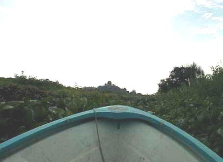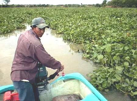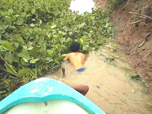 I took off my sandals and put my wallet in my backpack, rather looking forward to taking my chances with the flesh-eating weeds and getting out of the intense sun. As I stepped on the steep bank my foot slid around in the slime. My untrained toes could find no purchase. "Mister, mister", the boatman protested, motioning me back into the boat. He soon enlisted a farmer to help pull the boat slowly through the weeds.