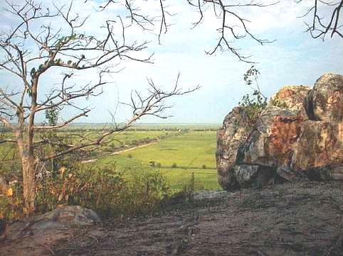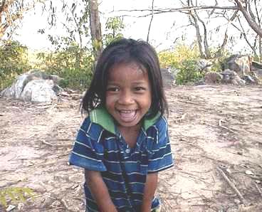 The canal finally started to clear, and the farmer collected a fee of 1000 riel--about 30 cents--and we puttered on under the diminished power of the wheezing outboard, which coughed blue smoke. The fishgate, however, was hopelessly jammed, and the water was too deep for hauling. Our boatman climbed out, up the bank, and disappeared. At the top of the bank a group of children appeared, and edged closer for a better look at these two barangs sitting in boat, watching the sun set over the distant Phnom Da.