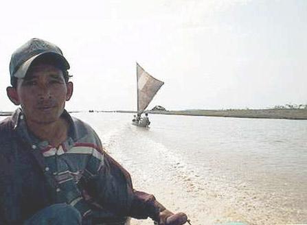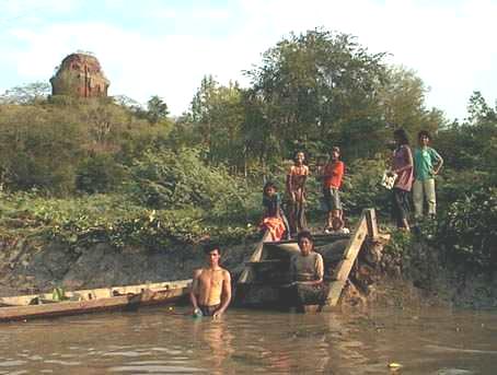 Amid the riverboats were a few small, open speedboats. Their operators surrounded us with offers of "o-bua, o-bua", which is what's left of the word "outboard" after a trip from English through French to Khmer. This is the dry season, and business must be slow; the road to Phnom Da was well above water, running through the rice fields parallel to the canal. Both led due east, straight as arrows to the horizon and Vietnam not far beyond. The last time I was visited the old temple was in the rainy season of 1996, and the fields were submerged as they are each year. Takeo was a peninsula, Phnom Da was a distant island, and the price of a boat there was twice as much. Now the offers started at $20, and fell to $15. As we boarded our choice, the offers from losing bidders dropped to $10, but they had missed their chance.