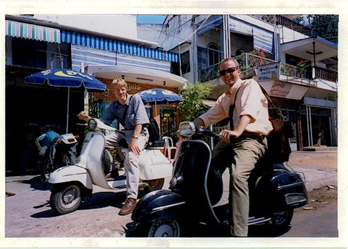 RIDING IN STYLE (April 1998) - Michael Wills and Chris Decherd take a lunch break from work at The Cambodia Daily. 1960s vintage Vespa scooters are popular with younger expats and older Cambodians, but scorned by young Cambodians, who prefer new Hondas and Suzukis. In the background is Chiang Mai Restaurant in its old location on Sothearos Boulevard.