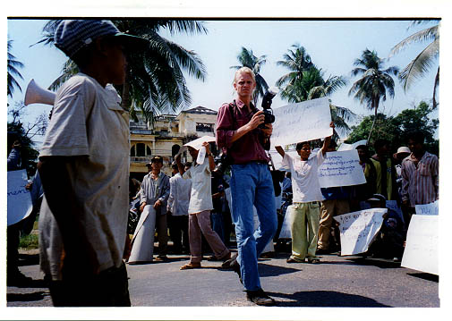 ON THE PROWL (March 1998) - Legendary shutterbug David van der Veen, aka The Dutchman, hunting for shots he can send to Agence France-Presse. The next day he was on the ill-fated helicopter trip to Preah Vihear temple on the Thai border. Touching down near the the ancient temple, just days after the government reclaimed it from the Khmer Rouge, the helicopter toppled over in a minefield, detonating one with its tail. The most serious injury was a broken collarbone suffered by a British Embassy official.