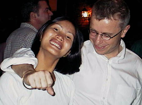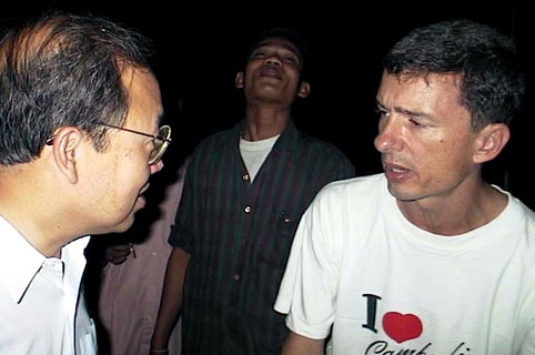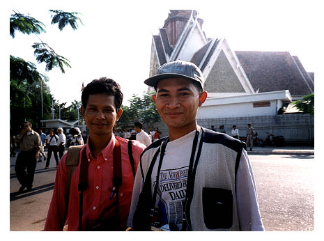 NEW GENERATION (March 1998) - Heng Sinith and Lor Chandara, two of the best young Cambodian journalists. Sinith was the photographer for the Cambodia Today and LC was one of the first reporters at The Cambodia Daily when it started in 1993. Behind them is the National Assembly building. Just visible at the left are Jonathan Prentice, then of the lengthily named Office of the Personal Representative of the United Nations Secretary General, Laura Ngo, then of Indochine Productions and Seth Mydans of the New York Times.