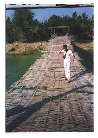 SECOND THOUGHTS - This wire and bamboo bridge over an inlet on the east bank of the Mekong acros from Phnom Penh sways crazily when anyone walks across it, let alone rides a motorbike. Luckily the water was low and we were able to choose a different spot to ford the stream. (April 1996)