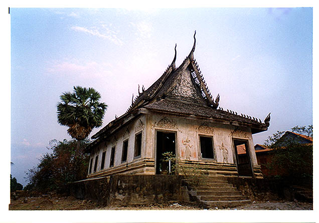 OUT OF TIME - A temple in the Lao style graces a small town on the east bank of the Mekong, 17 km north of Kratie. Once I find my map I'll be able to figure out the name of the town. Older temples like these seem to be falling out of favor as new, large temples decorated with paintings of their benefactors rise all over Cambodia. (April 1996)